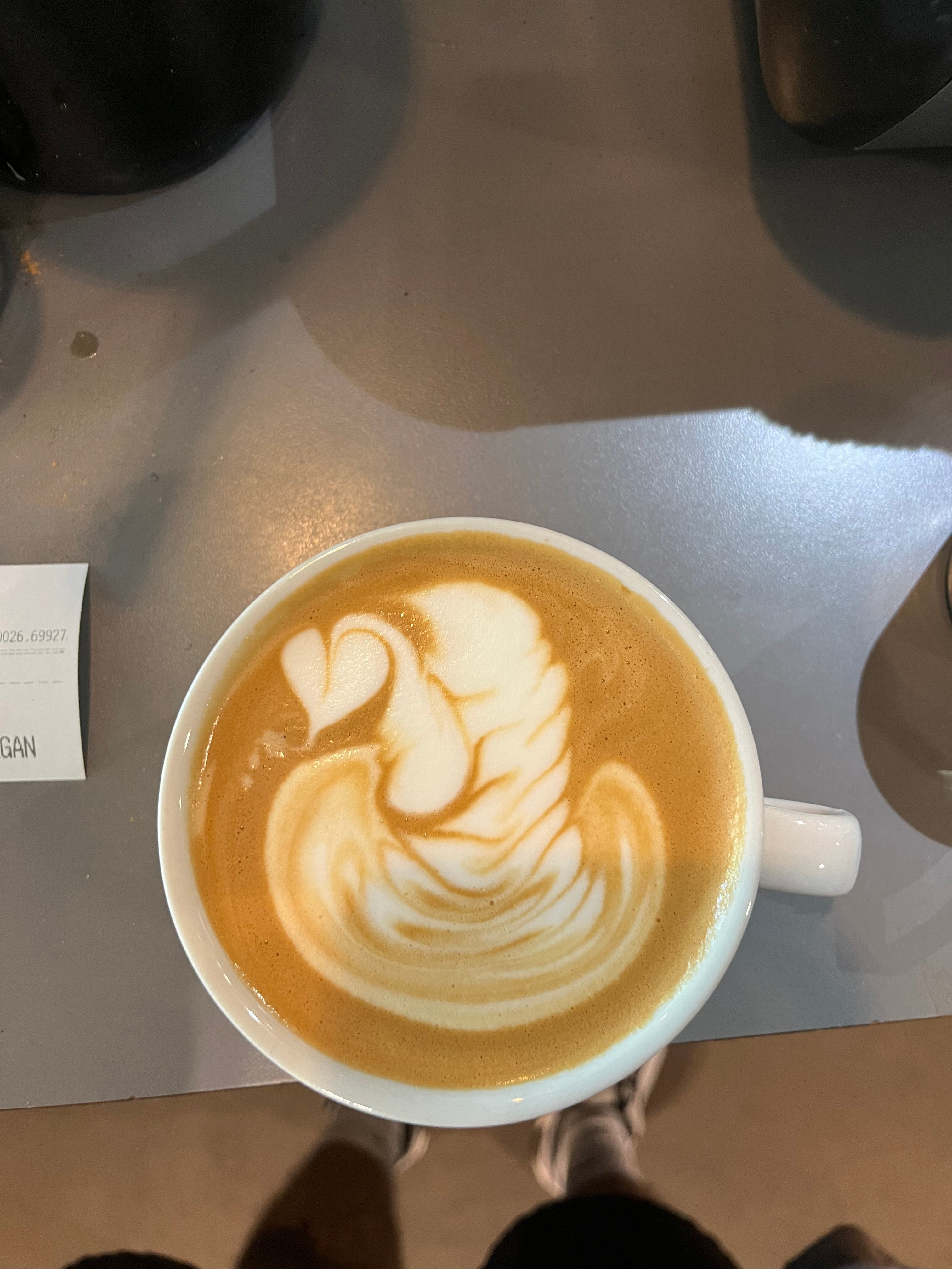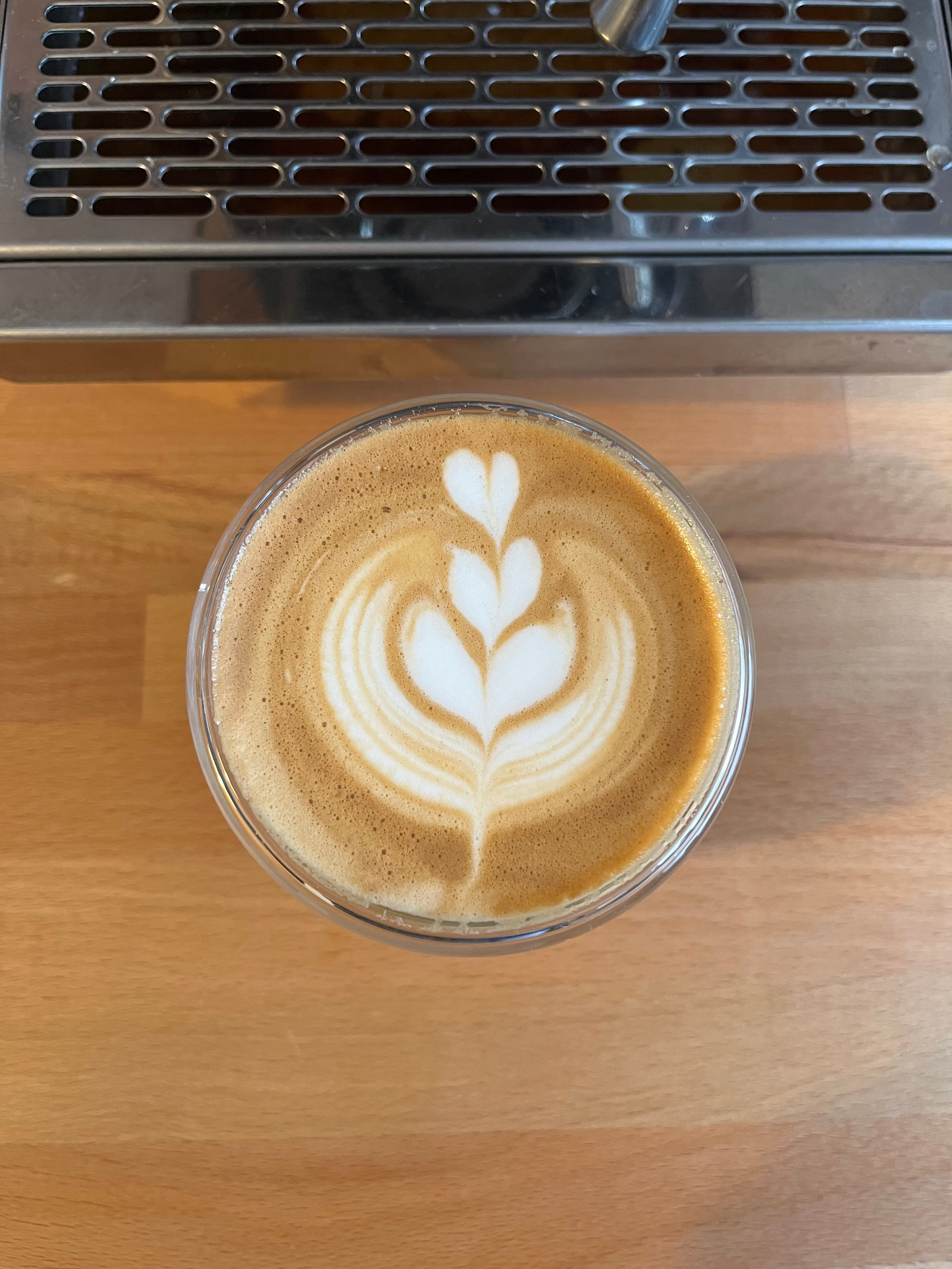 Gießen: Halte die Kanne schräg und gieße die Milch langsam in den Espresso. Beginne in der Mitte und bewege die Kanne nach Bedarf, um Latte Art zu erstellen.